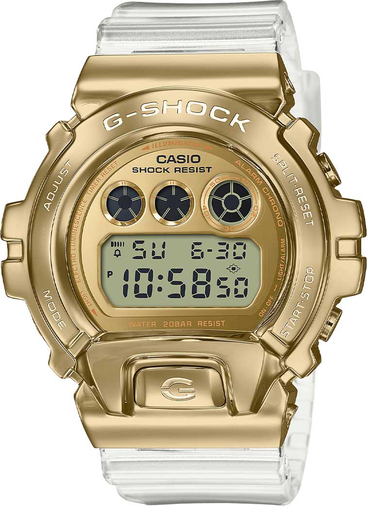 Часы Casio G-Shock GM-6900SG-9 — это эффектная интерпретация культового «трехглазого» силуэта в премиальном исполнении. Модель выделяется золотистым корпусом из нержавеющей стали с ионным напылением, который контрастирует с полупрозрачным «скелетон» ремешком, создавая яркий и современный образ. Несмотря на обновленный дизайн, часы сохраняют легендарную ударопрочность G-Shock и водонепроницаемость до 200 метров, предлагая владельцу полный набор функций: электролюминесцентную подсветку, секундомер, таймер и многофункциональный будильник.